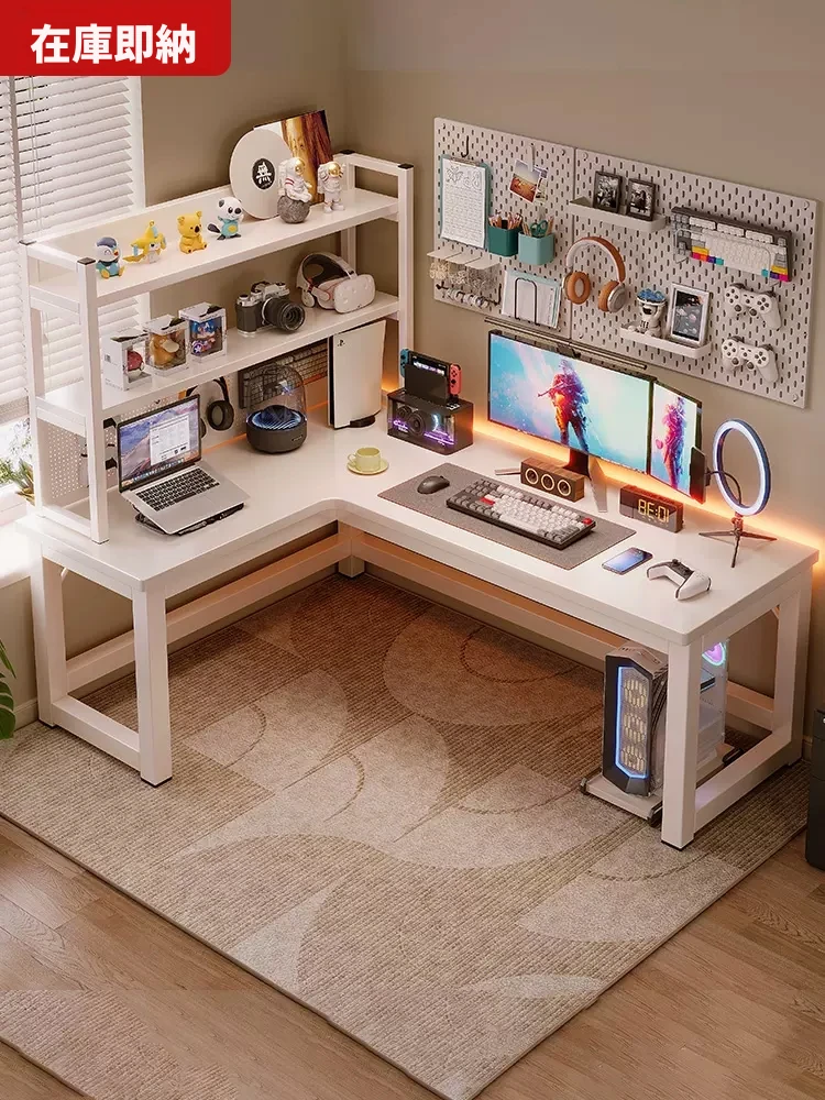L型コーナーデスク|スタイリッシュなゲーミングデスク|2人用家庭用|寝室にぴったり|収納力抜群の穴あきボードシェルフ付きコンボセット