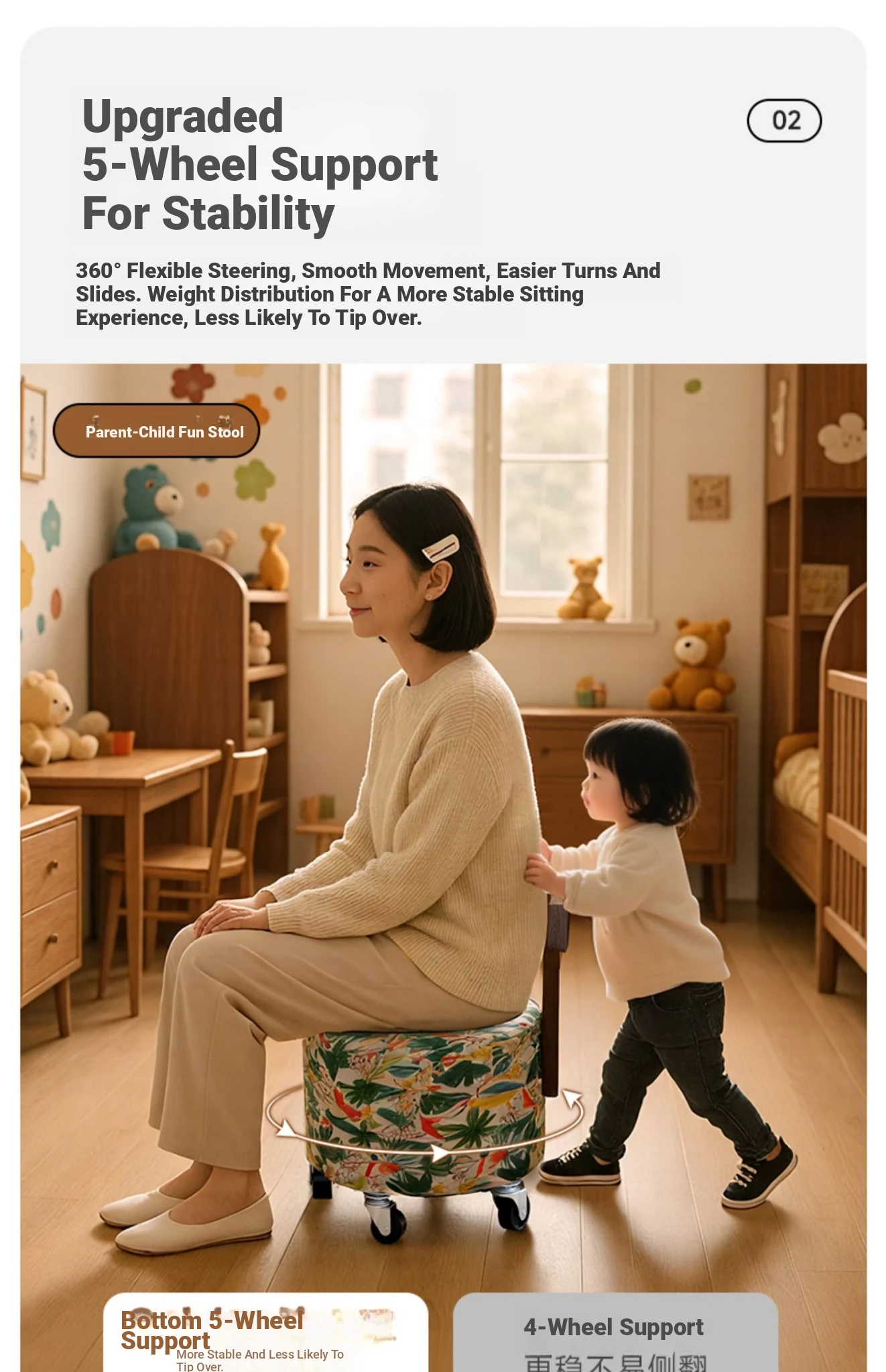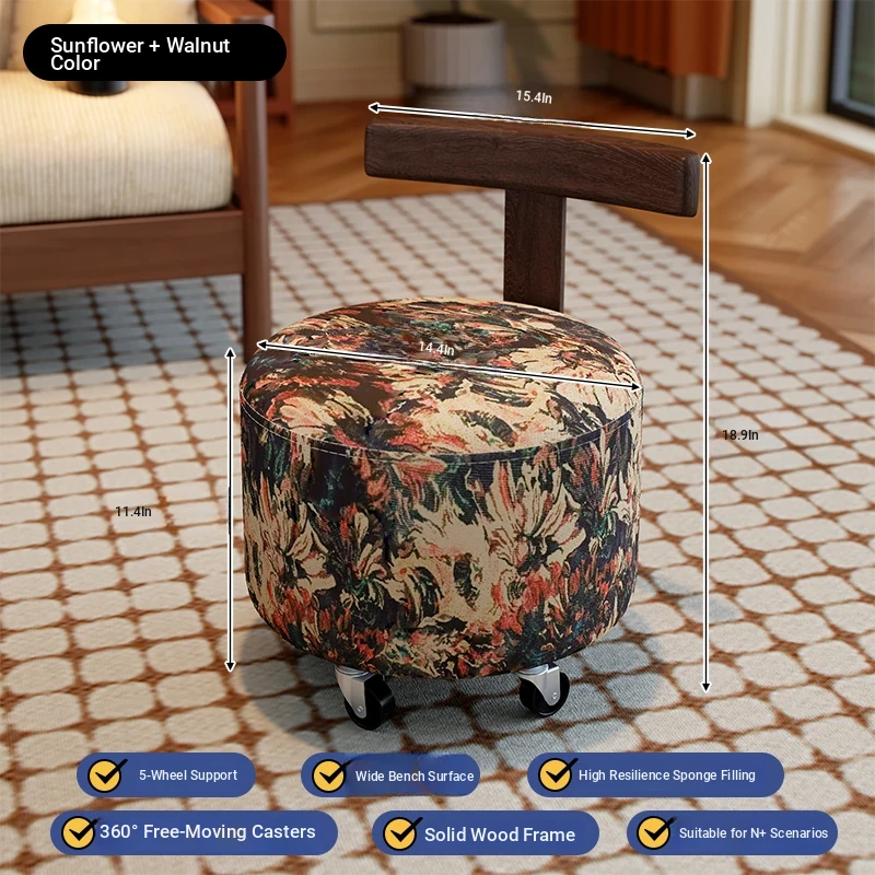 【New Upgraded Five-Wheel Model】Sunflower - Solid Wood Stool with Wheels
