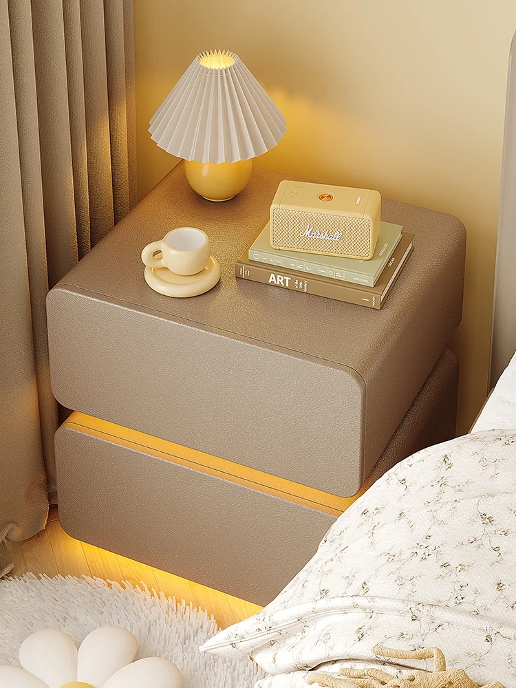 Creamy Luxury Nightstand with Light - Solid Wood Bedside Cabinet for Master Bedroom, Modern Minimalist Storage Solution