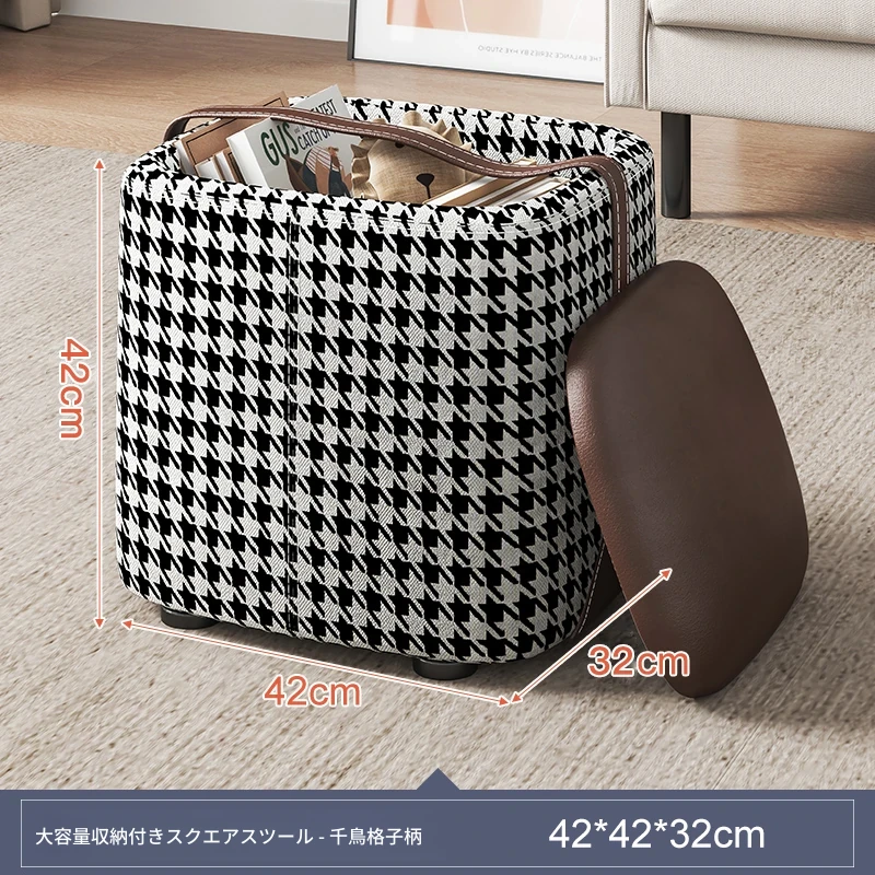 【大きなスクエアスツール収納タイプ】千鳥格子+ブラウンコーヒー休憩用テーブルスツール