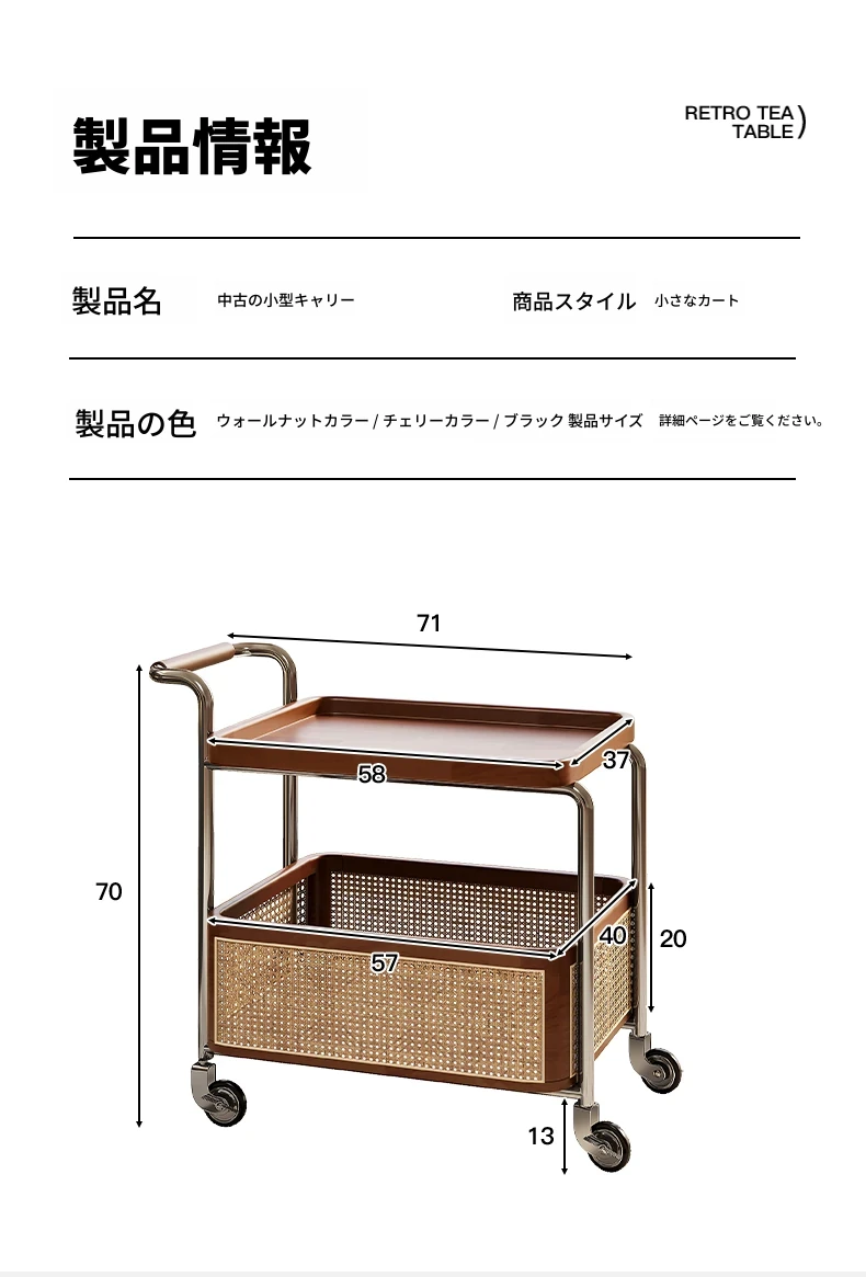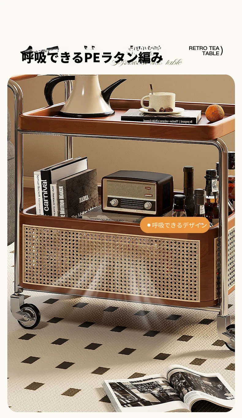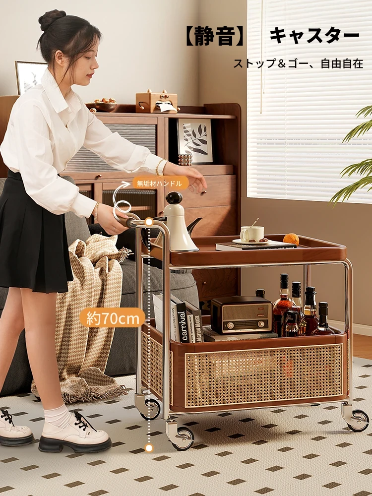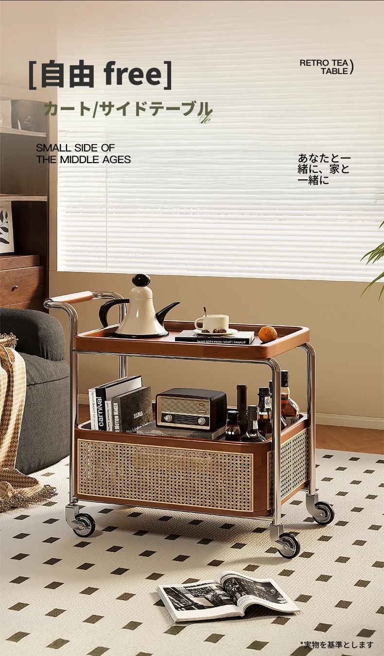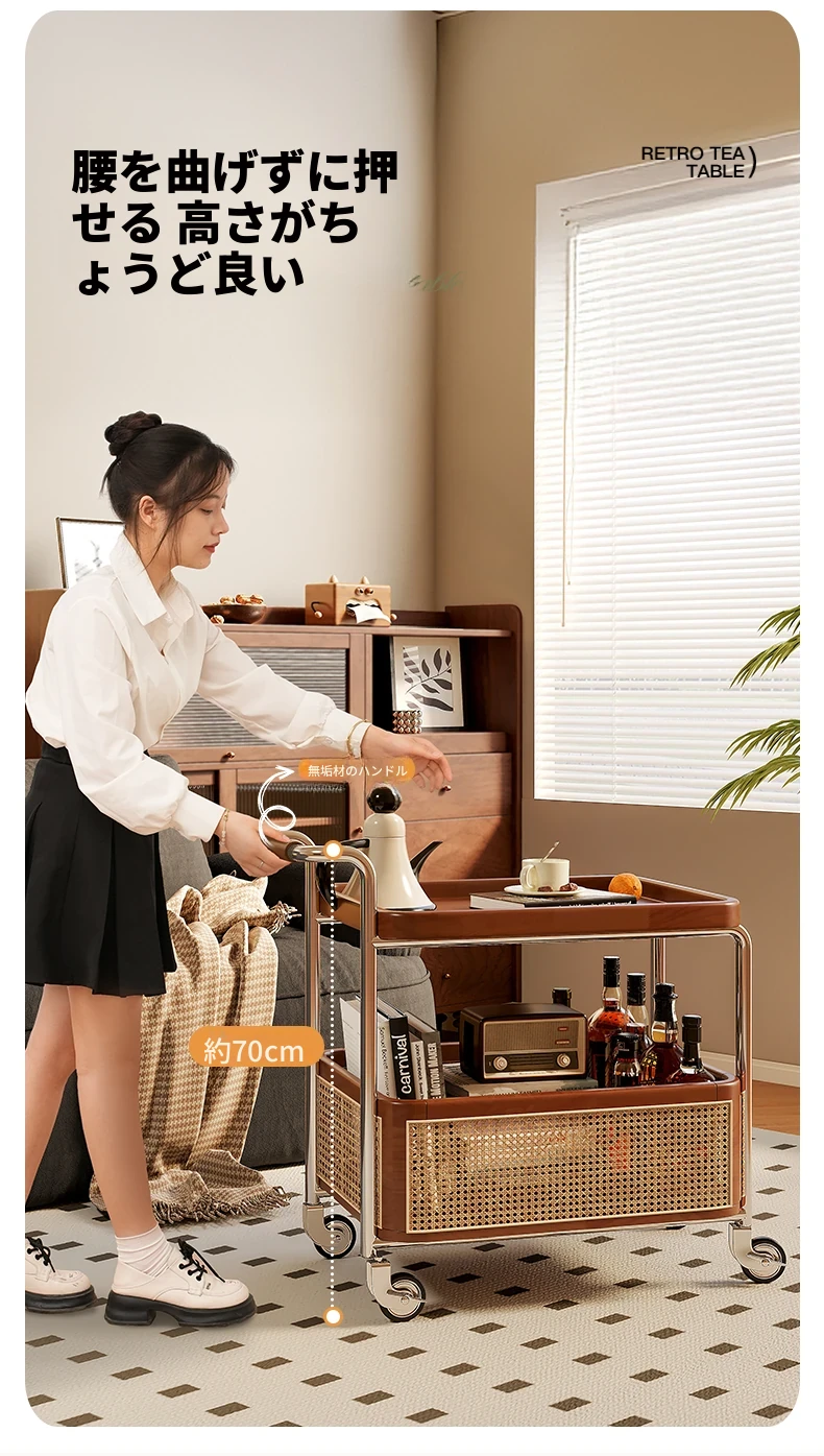 アンティーク風の無垢材移動式キャビネット - リビングやベッドサイドに最適な小型サイドテーブル、コンパクトなダイニングカーとしても活躍!あなたの生活空間をおしゃれに演出します。