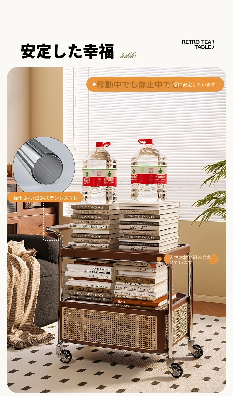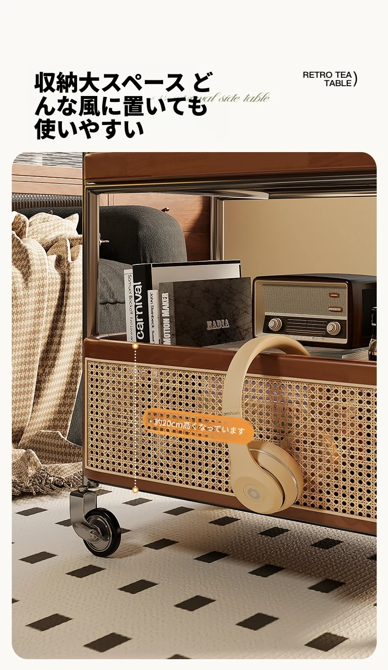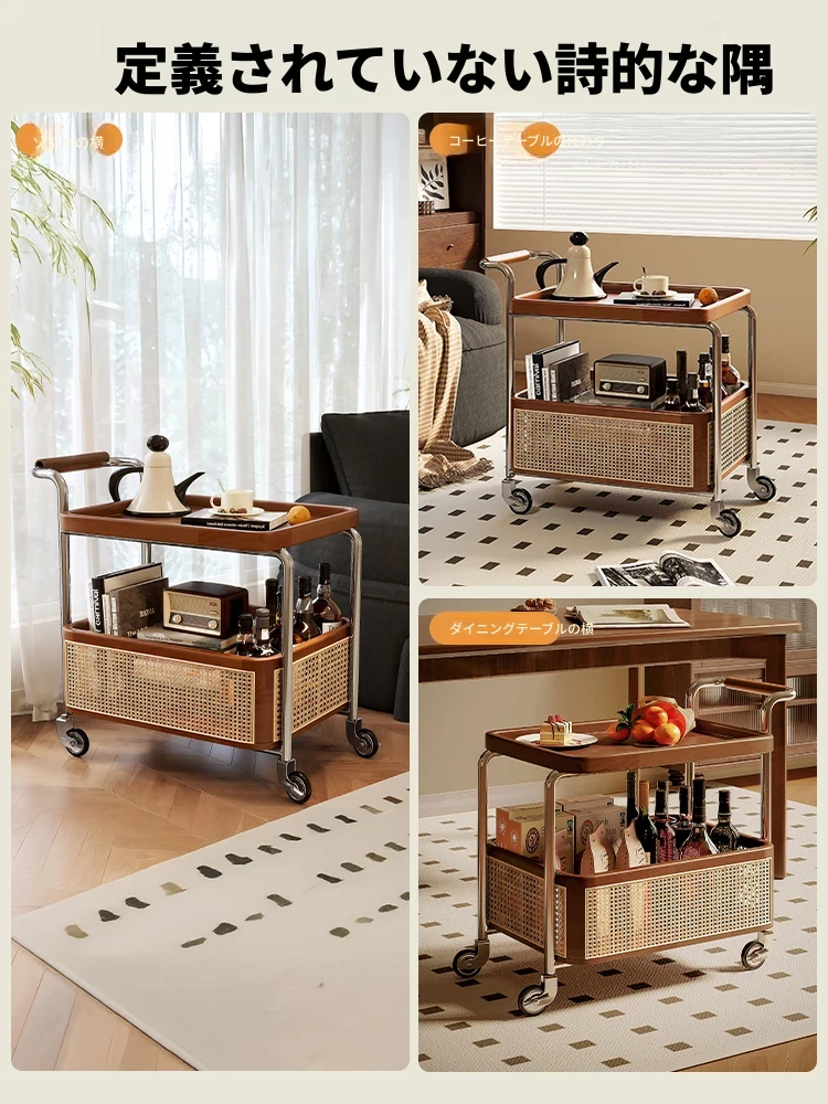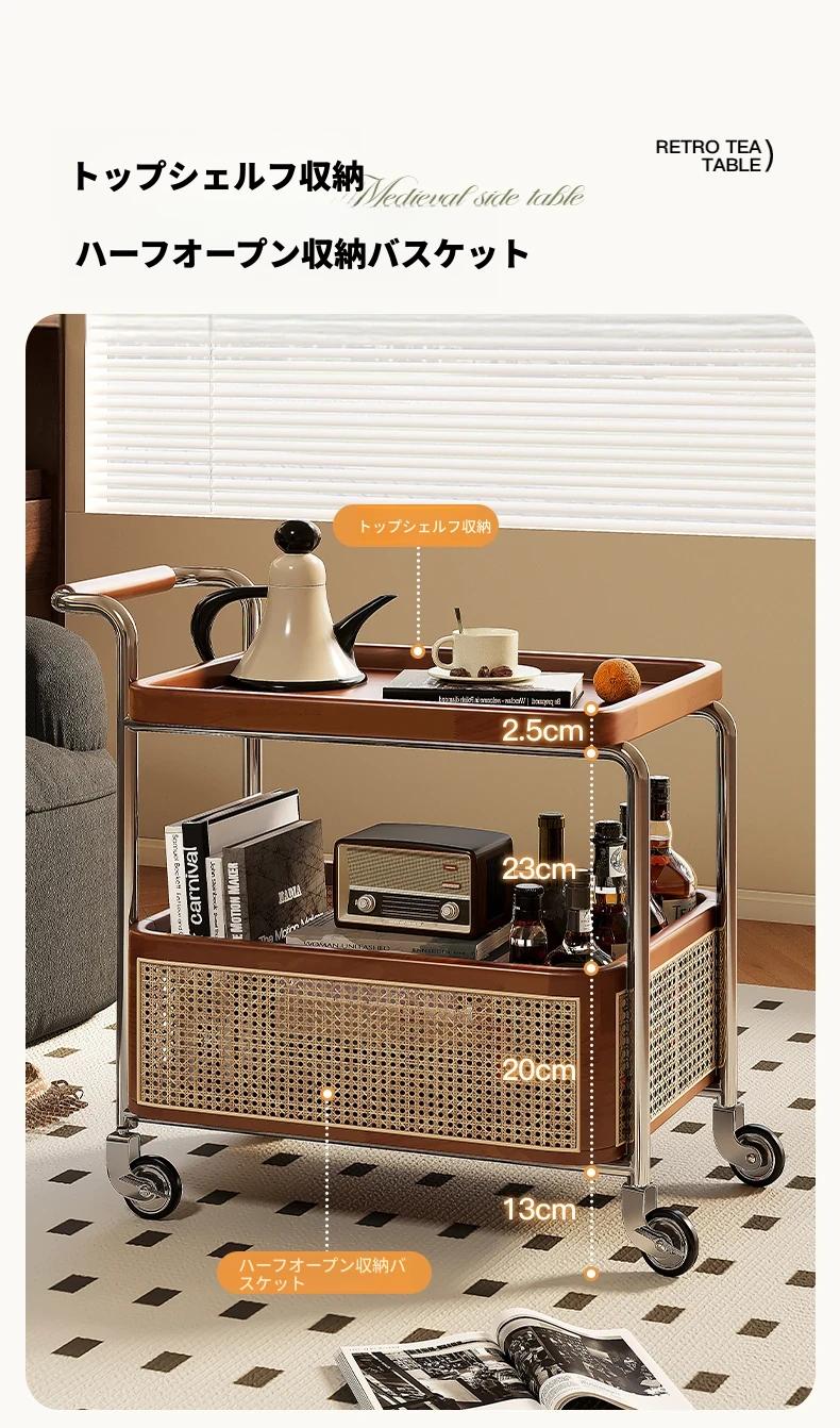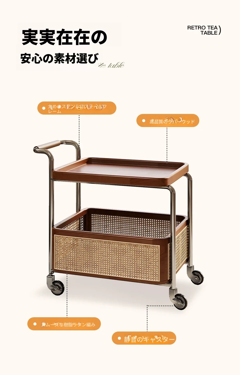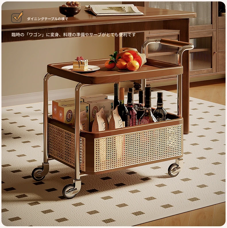 アンティーク風の無垢材移動式キャビネット - リビングやベッドサイドに最適な小型サイドテーブル、コンパクトなダイニングカーとしても活躍!あなたの生活空間をおしゃれに演出します。