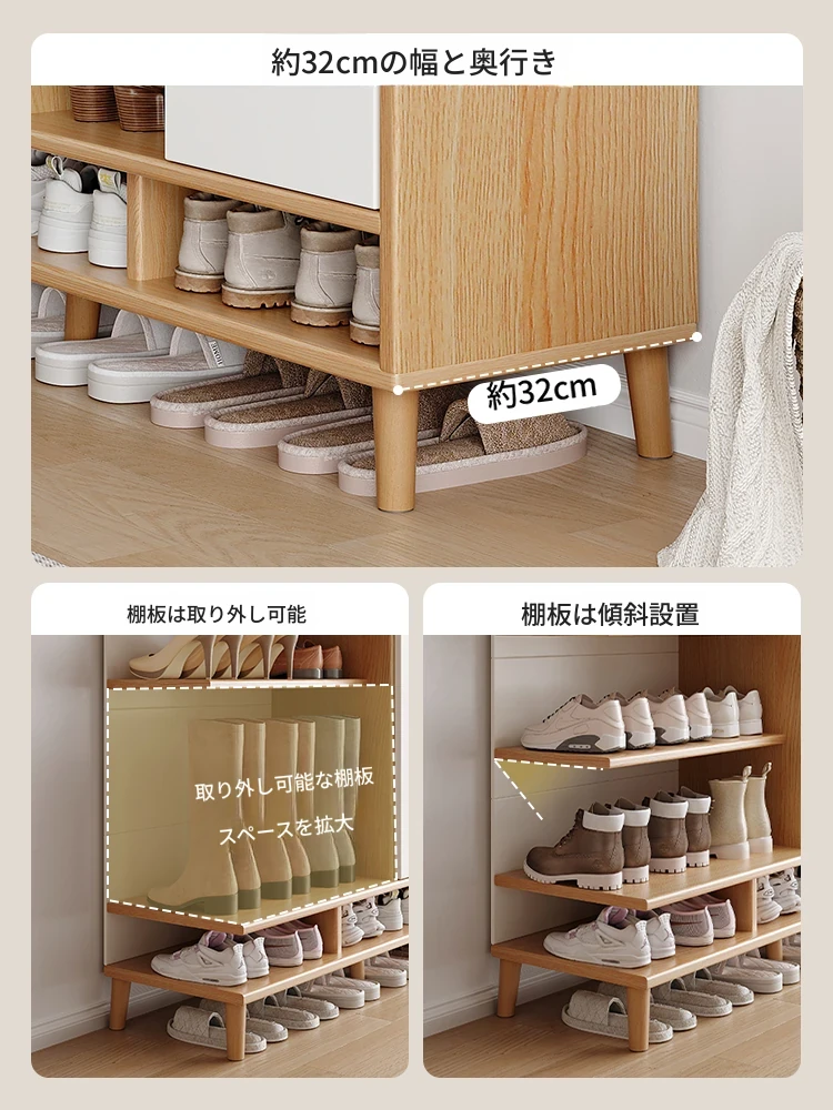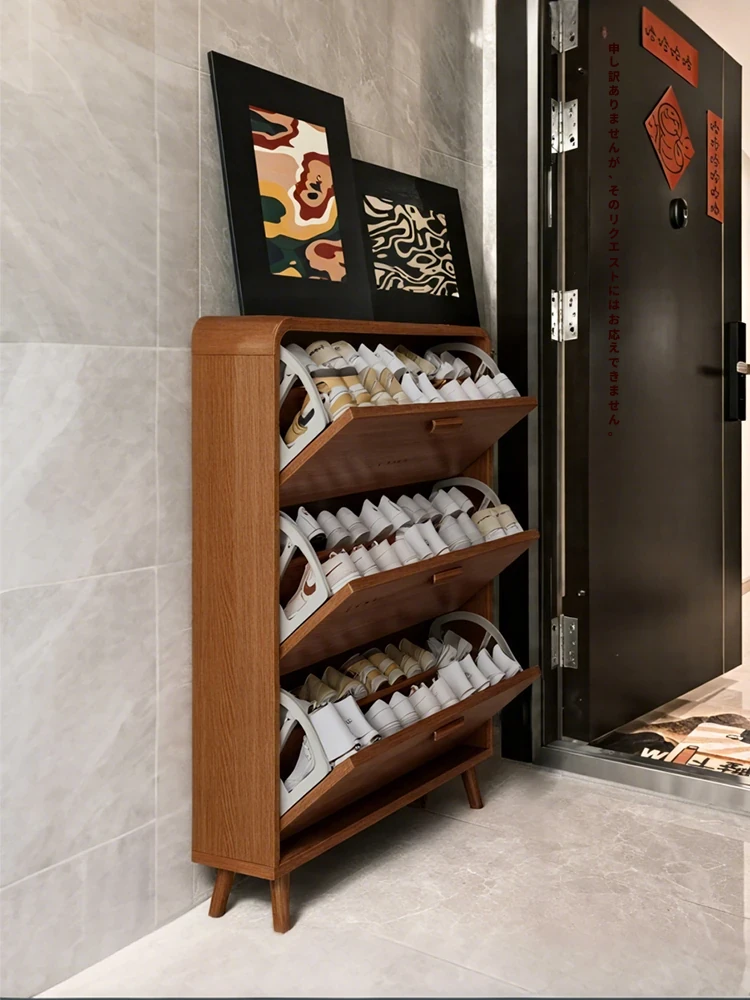 超薄デザインの靴箱 - 家庭用玄関収納、狭い廊下にもぴったり!高品質の無垢材を使用した多層式シューラック、エレベーターにも対応。スタイリッシュで機能的な玄関を実現します!