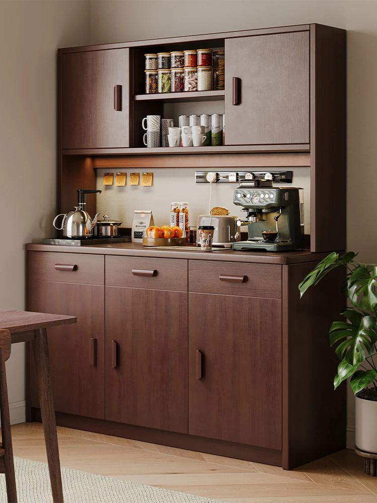 壁に寄せられる無垢材のダイニングサイドキャビネット - ワインキャビネット・ティーキャビネット・キッチン収納に最適!リビングルームにぴったりの収納力抜群のキャビネットで、すっきりとした空間を実現!