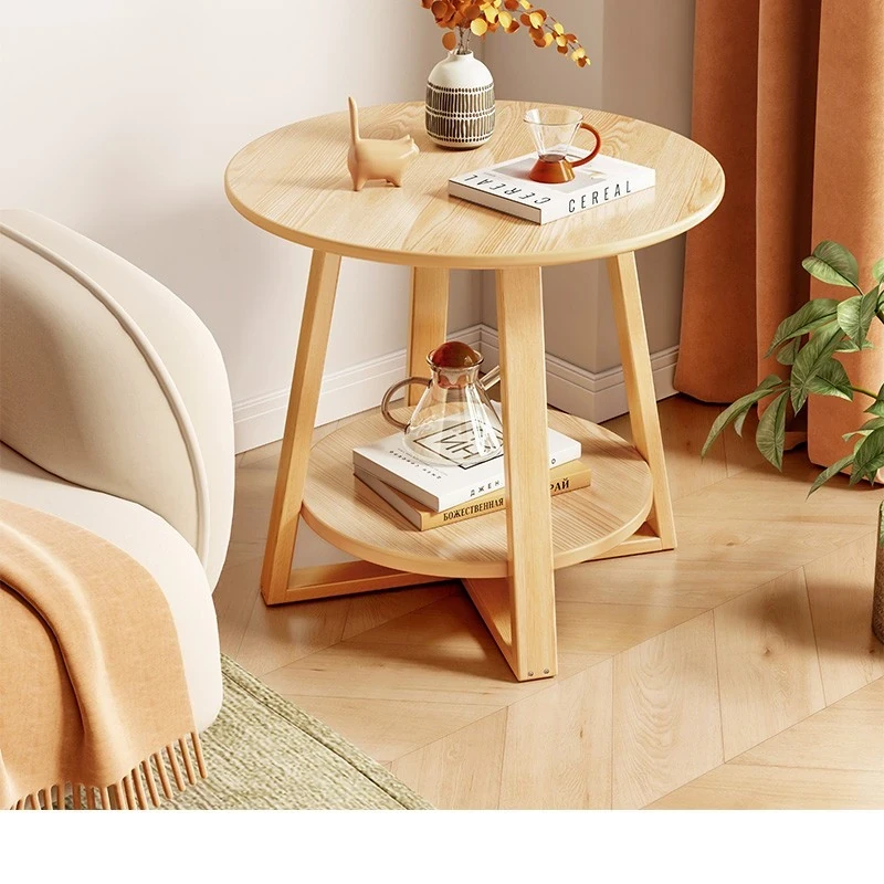 リビングに最適!実木製のシンプルな2段小型丸テーブル - ソファ横やバルコニーにぴったりな収納付きミニテーブル。狭いスペースでもおしゃれに収納力UP!